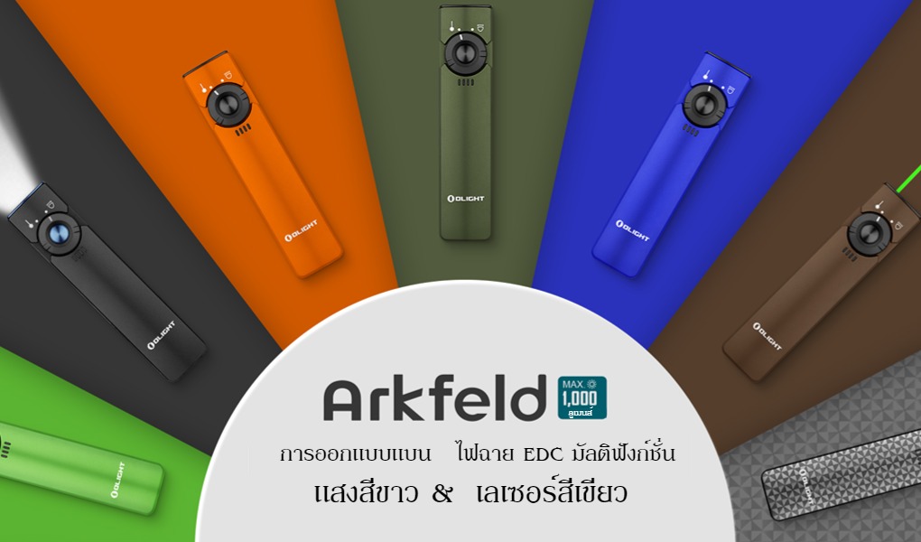 Olight Arkfeld ไฟฉายพกพาแหล่งกำเนิดแสงคู่เป็นเครื่องมือส่องสว่างที่ดีที่สุดสำหรับทุกความต้องการของคุณ ด้วยแสงสีขาวความสว่าง 5 ระดับที่ให้กำลังส่องสว่างสูงสุด 1,000 ลูเมน และลำแสงสีเขียวที่มีเอาต์พุตปลอดภัย ≤0.39mW Class 1 ทั้งอเนกประสงค์และทรงพลัง