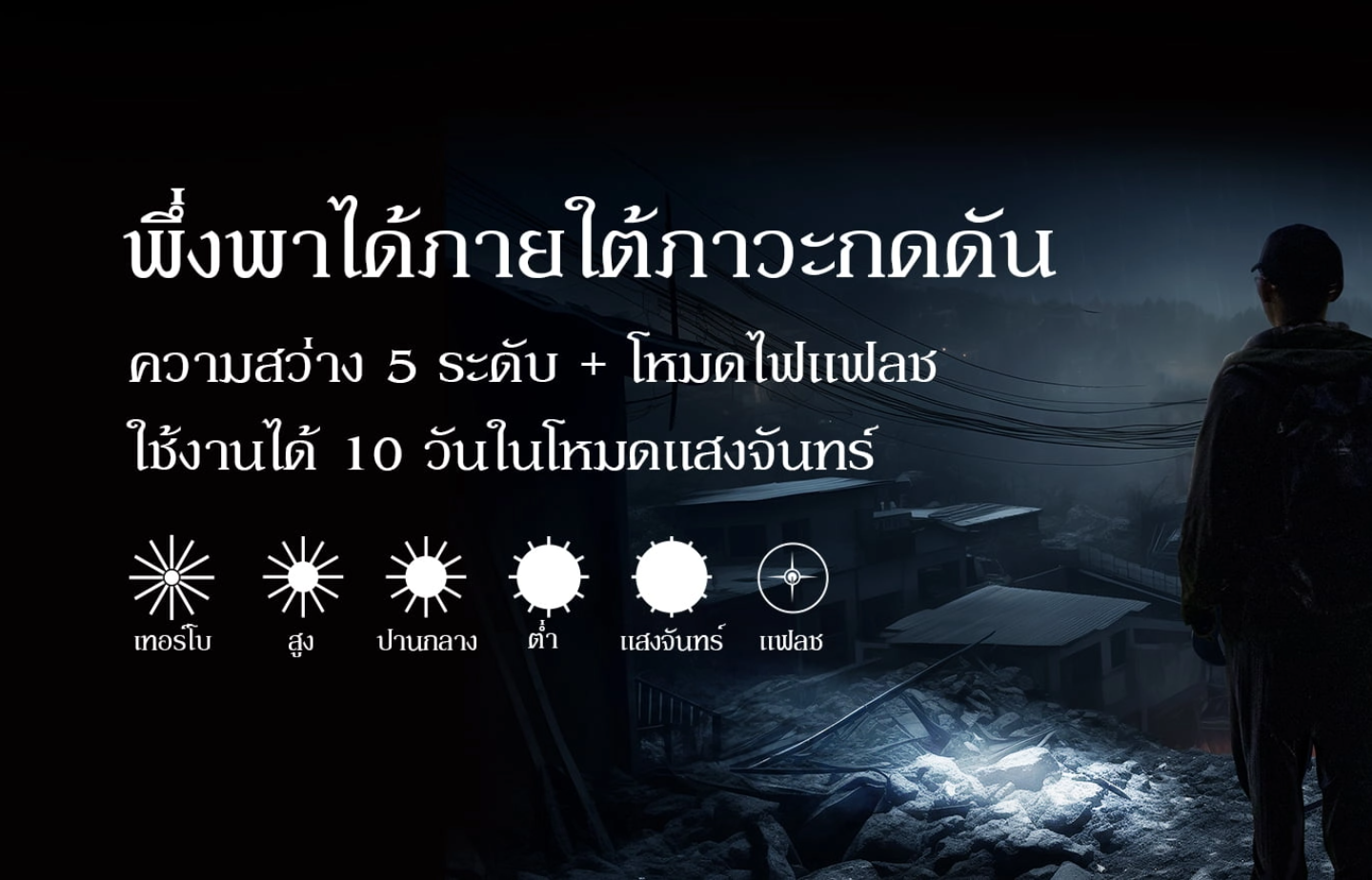Arkflex มีระดับความสว่าง 5 ระดับและโหมดไฟแฟลชเพื่อรองรับการใช้งานที่หลากหลาย และตอบสนองทุกความต้องการ ตั้งแต่งานที่ละเอียดอ่อนที่ต้องใช้แสงนวลไปจนถึงสถานการณ์ที่ต้องการความสว่างจนแสบตาสำหรับการป้องกันตัวเองหรือการส่งสัญญาณฉุกเฉิน