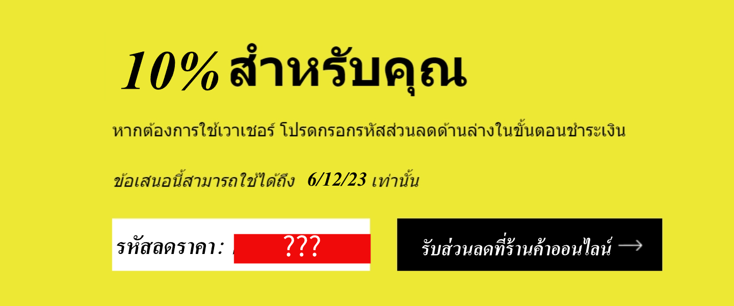 (หมายเหตุ: เมื่อสมัครสมาชิกเรียบร้อยแล้ว โค้ดส่วนลดจะถูกส่งทางอีเมล หากคุณไม่ได้รับโปรดติดต่อฝ่ายบริการลูกค้า