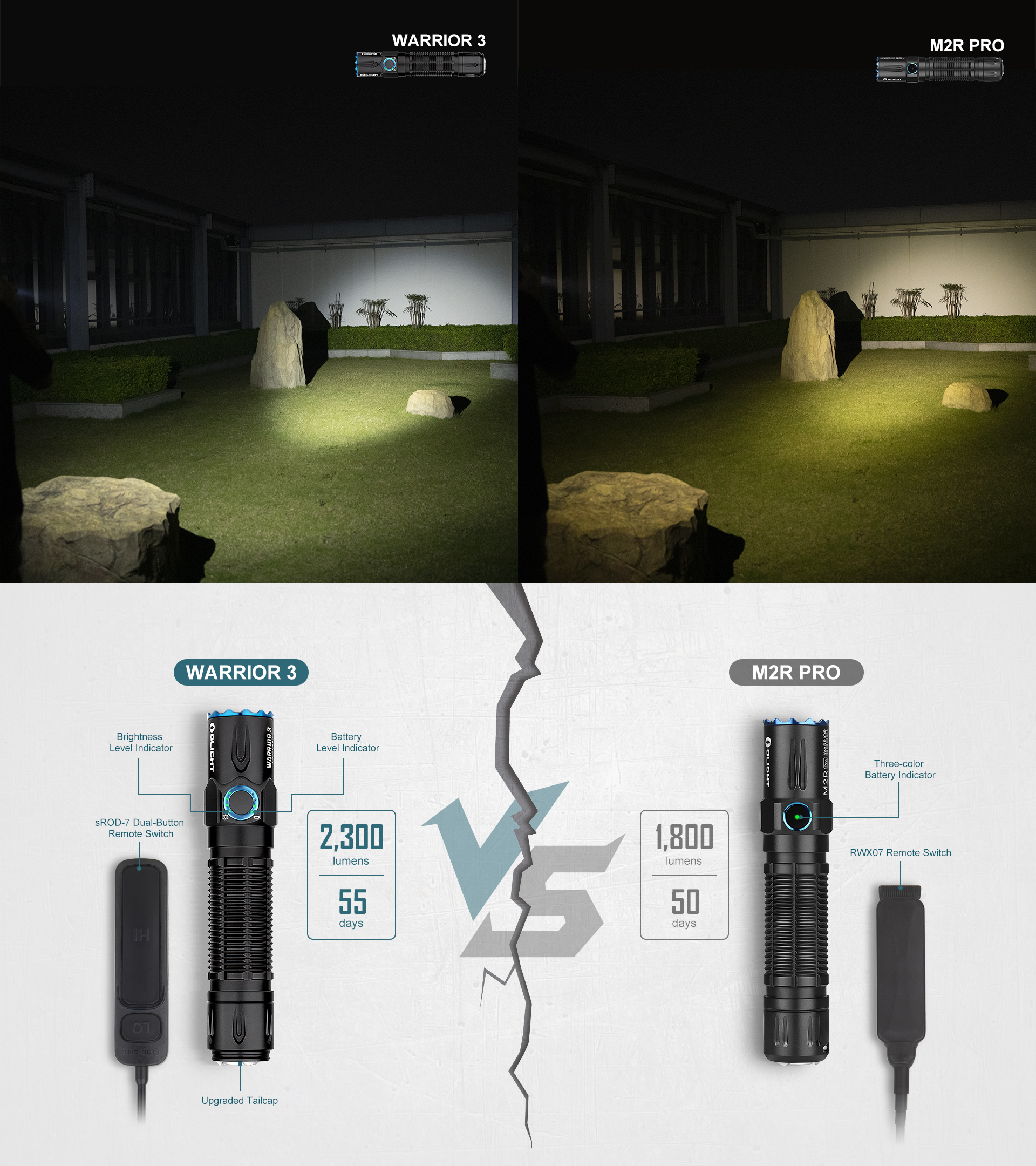 Warrior 3 ใช้ลูกปัดโคมไฟ SFT-70X พร้อมเลนส์ TIR สามารถ ให้ความสว่างสูงถึง 2,300 ลูเมน ซึ่งสว่างกว่า M2R Pro Warrior รุ่นก่อน 28% และส่องระยะไกล 300 เมตร คุณจะไม่กลัวความมืด