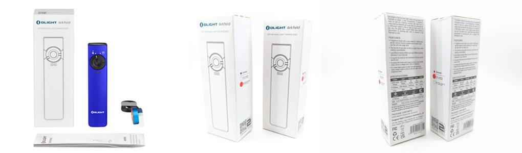 แพ็คเกจที่เรียบง่ายประกอบด้วยไฟฉาย Arkfield สายชาร์จ MCC 3 และ คู่มืนการใช้งาน
