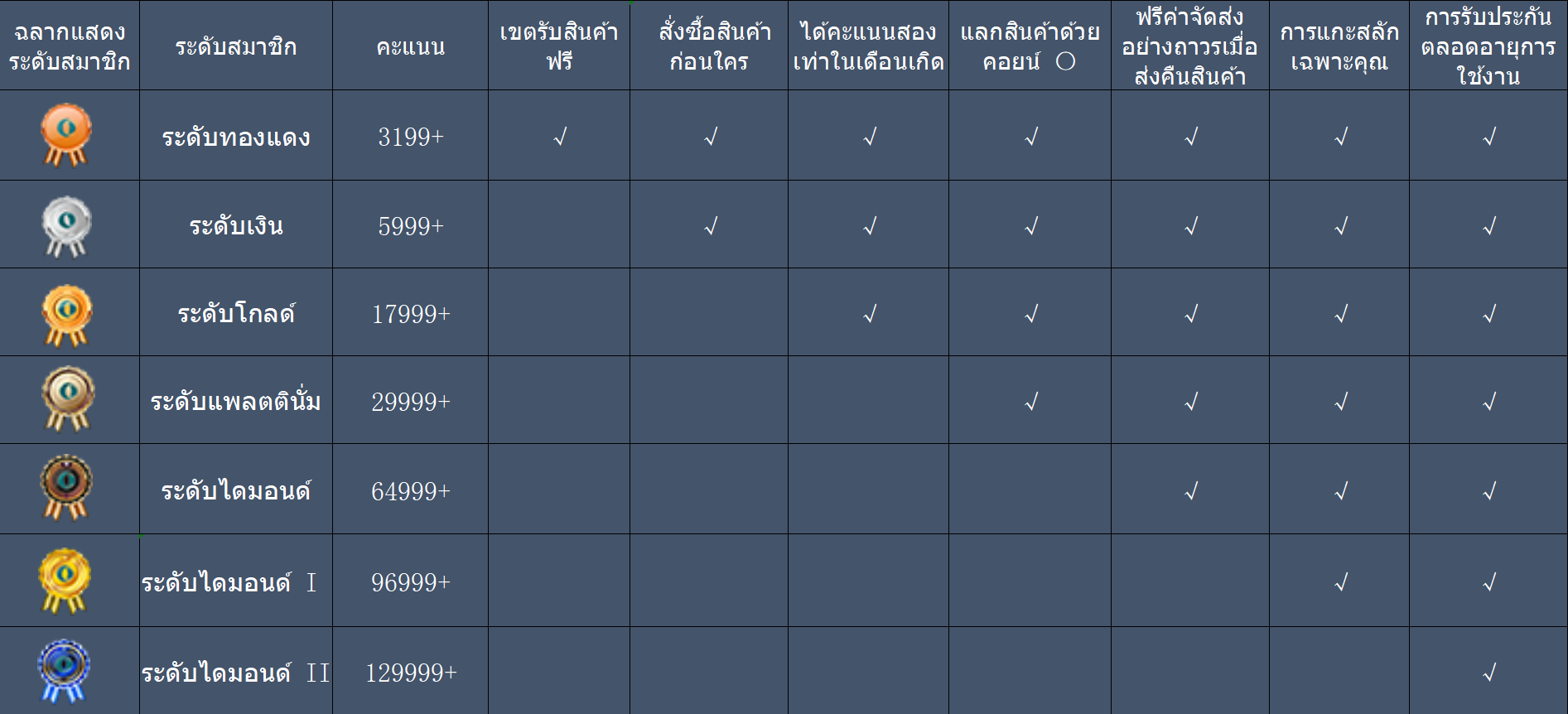 1. ระดับทองแดง(3199 ≤ คะแนน < 5999):เข้าสู่ระบบและรับสินค้าที่แจกฟรีในเขตรับสินค้าฟรีได้ จำกัดคนละรับได้ชิ้นเดียวเท่านั้นในแต่ละครั้ง สินค้าที่รับฟรี จะต้องชำระค่าจัดส่งด้วย หากคุณสั่งซื้อสินค้าอื่นๆด้วยและยอดซื้อเกิน 1499 บาท คุณจะไม่ต้องชำระค่าจัดส่งอีก