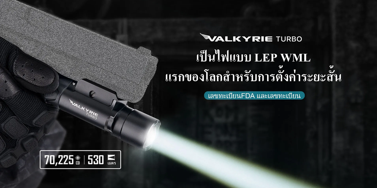 ไม่เพียงเท่านั้น เพื่อตอบสนองความต้องการของผู้ใช้ไฟติดปืนระยะไกล Olight ได้เปิดตัวผลิตภัณฑ์นวัตกรรมรุ่นแรกของอุตสาหกรรม นั่นก็คือไฟฉายยุทธวิธี LEP: Valkyrie Turbo ในเดือนมิถุนายน ปี 2565 หลังจากการวิจัยและพัฒนามากว่าสามปี ต่างจากไฟฉายรุ่นเดิมที่ใช้ LED เป็นแหล่งกำเนิดแสง Laser-excited phosphor (LEP) เป็นกระบวนการที่ลำแสงเลเซอร์สีน้ำเงินพุ่ง (สะท้อน) ไปบนชั้น phosphor ที่รองรับโดย sapphire substrate หลังจากผ่านเลนส์โฟกัส ลำแสงเลเซอร์สีน้ำเงินกระตุ้นสารเรืองแสงและแปลงเป็นแสงสีขาวเจิดจ้า ตรงกลางของลำแสงไฟฉาย LEP จะสว่างมากและมีสปอตไลท์ที่แน่นหนา ไฟฉาย LEP จะสว่างกว่าไฟฉาย LED ที่มีกำลังส่องสว่างเท่ากัน Valkyrie มีความเข้มแสงสูงสุดที่ 70,225 แคนเดลา และแม้ว่ากำลังส่องสว่างของ Valkyrie Turbo จะอยู่ที่ 250 ลูเมน แต่ก็มีระยะลำแสงไกลถึง 530 เมตร เนื่องจากลำแสง LEP นั้นแคบ และแทบไม่มีการกระจายเลยความเข้มของแสงจะสูงขึ้นเมื่อส่องในระยะห่างเท่ากันซึ่งทำให้สว่างยิ่งขึ้นและเหมาะสำหรับการยิงที่แม่นยำในระยะยาว การตรวจจับเป้าหมาย และการป้องกัน แม้จะมีความสามารถในระยะไกล แต่ Valkyrie Turbo ของ Olight มีขนาดกะทัดรัด ทำให้เหมาะสำหรับทั้งปืนพกและปืนสั้น/ปืนไรเฟิลความยาวปานกลาง