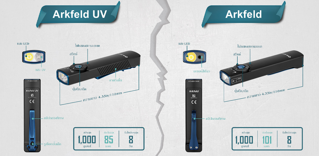 ไฟฉายรุ่นนี้เอาต์พุตแสงสีขาวและแสงเลเซอร์สีเขียวได้ ไฟฉายรุ่นนี้ไม่เพียงแต่เหมาะสำหรับการประชุมและการนำเสนอในสำนักงาน ยังเหมาะสำหรับชีวิตประจำวันด้วย ถึงแม้ว่าเป็นรุ่นที่นิยมมาก แต่ก็มีแฟนๆ และผู้ใช้ Olight จำนวนมากที่แสดงความคิดเห็นและข้อเสนอแนะต่างๆ ส่วนใหญ่พูดถึงเอาแสง UV มาแทนเลเซอร์สีเขียว และเราได้ดำเนินการและตระหนักถึงข้อเสนอแนะนี้แล้ว นั่นก็คือ Arkfeld UV ที่เวอร์ชันใหม่ในครั้งนี้