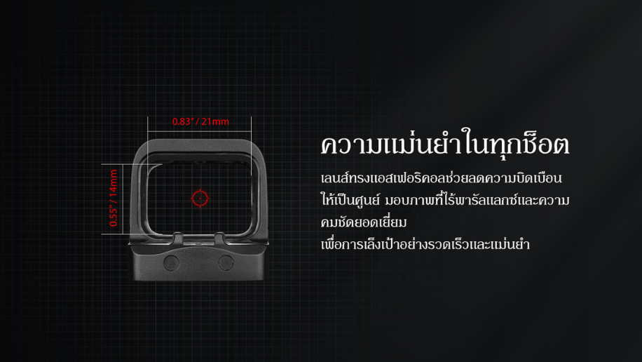 เลนส์ทรงแอสเฟอริคอลให้ภาพเล็งที่ปราศจากพารัลแลกซ์และความบิดเบือน ผ่านช่องเล็งที่กว้าง ช่วยให้คุณล็อกเป้าได้จากทุกมุม