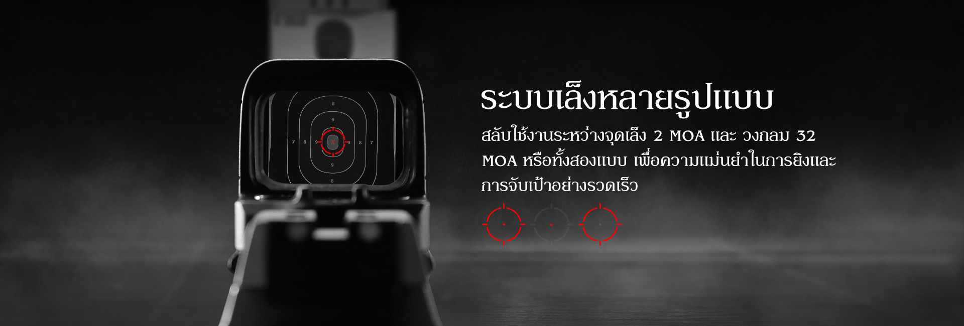 ระบบเล็งหลายรูปแบบให้คุณเลือกใช้ระหว่างจุดเล็ง 2 MOA ที่คมชัด วงกลม 32 MOA ที่มองเห็นง่าย หรือใช้ร่วมกันทั้งสองรูปแบบ