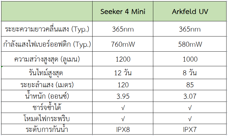 หรือกิจกรรมอื่นๆ ที่ต้องการแสงน้อย นอกจากนี้ Seeker 4 Mini ยังมีแสง UV ที่มีพลังงานไฟฟ้าถึง 760mW แต่